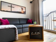 "Castor", apt 2 pièces 40 à 47 m2. Logement idéal pour 2 adultes + 2 enfants. Aménagement moderne et de bon goût: entrée. Séjour/chambre à coucher avec 1 divan-lit double, coin repas, TV (satellite) et écran plat. 1 chambre double. Cuisine ouverte (four, lave-vaisselle, 4 plaques vitrocéramiques, four micro-ondes, cafetière électrique, Capsules pour machine à café (Segafredo) (NON INCLUSES)). Douche/WC. Belle vue sur la localité. A disposition: Internet (Connexion WIFI, gratuit). Place de parking (en sus), garage (en sus). Veuillez noter: logement non-fumeur. Cette location est un exemple de location / d'appartement. Pour toute demande spéciale, merci de bien la faire durant votre réservation, nous ne garantissons pas qu'elle soit reçue favorablement sur place. 50503-004623-2020- Caractéristiques de l'hébergement