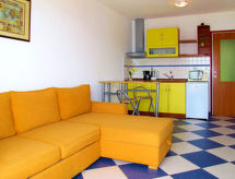 "Chantal (RAC150)" studio 27 m2. Clair: Studio avec 1 divan-lit double, TV (satellite) et air-conditionné. Sortie sur le balcon. Cuisine ouverte (2 plaques vitrocéramiques, four micro-ondes, cafetière électrique). Douche/WC. Chauffage électrique. Balcon. Mobilier de balcon. Vue sur la mer. A disposition: coffre-fort. Internet (Connexion WIFI, gratuit). Veuillez noter: réfrigérateur sans compartiment congélateur, logement non-fumeur. Maximum 2 animaux/ chiens autorisés. Extincteur.- Installations