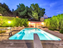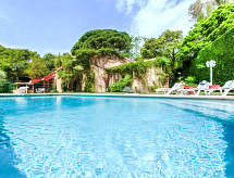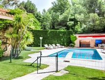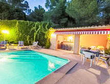"Chez Noux", villa 4 pièces 220 m2. Aménagement de bon goût: séjour/salle à manger avec TV (satellite) et chaînes de TV internationales (écran plat). Sortie sur le jardinet, sur la piscine. 2 chambres, chaque chambre avec: 2 lits (90 cm, longueur 190 cm). 1 chambre avec 1 grand-lit (200 cm, longueur 200 cm). Cuisine (4 plaques de cuisson, four, lave-vaisselle, grille-pain, bouilloire électrique, four micro-ondes, congélateur, cafetière électrique). Bain/bidet/WC, douche/WC. Pas de chauffage. Grande terrasse, jardinet. Meubles de terrasse, barbecue, chaises longues, loggia. Partielle vue éloignée sur la mer et les alentours. A disposition: lave-linge. Internet (Connexion WIFI, gratuit). Adapté(e) aux familles. HUTG-038972- Activités à proximité
