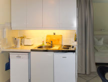 "Christina I", apt 2 pièces 65 m2 au 1er étage. Clair, aménagement fonctionnel: séjour/chambre à coucher mansardé avec 1 lit double, table pour les repas, coin-cuisine, TV (satellite), radio et lecteur CD. Sortie sur le balcon. 1 chambre double mansardée avec TV (satellite). Coin cuisine (2 plaques de cuisson, lave-vaisselle, grille-pain, bouilloire électrique, four micro-ondes, cafetière électrique). Bain/WC. Chauffage au gaz. Moquette. Balcon. Mobilier de balcon. A disposition: lit bébé. Internet (Connexion WIFI, gratuit). Veuillez noter: logement non-fumeur. Détecteur de fumée.- Installations