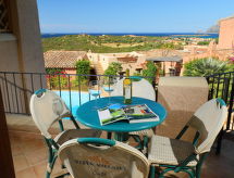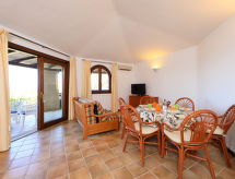 "Corbezzolo 11 - Vista Village", maison mitoyenne 3 pièces 70 m2, au rez-de-chaussée. Aménagement confortable et plaisant: grand séjour/salle à manger avec véranda avec 1 divan-lit double, TV (satellite) et écran plat. 1 chambre double. Sortie sur la véranda. 1 chambre avec 2 lits. Coin cuisine (4 plaques de cuisson, lave-vaisselle, congélateur) avec table pour les repas. Douche/bidet/WC. Air-conditionné (en sus). Terrasse couverte. Meubles de terrasse. Superbe vue sur la mer. A disposition: coffre-fort, sèche-cheveux. Place de parking No C11 (couvert, cloturée), largeur 230 cm. Services inclus: WI-FI, climatisation, parking, accès à la piscine, utilisation d'un court de tennis, lit bébé (sur demande), chaise haute (sur demande), sèche-cheveux, coffre-fort, kit de courtoisie (1 bouteille d'eau, 1 rouleau de papier toilette, 2 barres de savon). Le changement hebdomadaire des serviettes et des draps ne sera effectué que pour des séjours de 10 jours ou plus. Le nettoyage hebdomadaire ne sera effectué que pendant 14 jours au minimum. IUN:E2088- Caractéristiques de l'hébergement