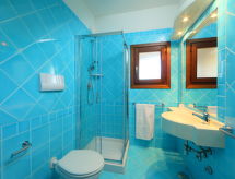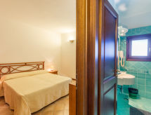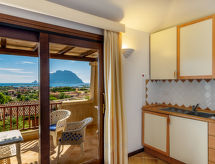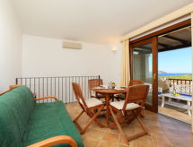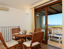 "Corbezzolo 9 - Vista Village", maison mitoyenne 2 pièces 52 m2 sur 2 niveaux. Aménagement confortable et plaisant: séjour/salle à manger avec véranda avec 1 divan-lit double, TV (satellite) et écran plat. Coin cuisine (4 plaques de cuisson) avec table pour les repas. À l'étage inférieur: 1 chambre double. Sortie sur la véranda. Douche/bidet/WC. Air-conditionné (en sus). Terrasse couverte. Meubles de terrasse. Superbe vue sur la mer. A disposition: coffre-fort, sèche-cheveux. Place de parking No C9 (couvert, cloturée), largeur 230 cm. IUN:E2088- Caractéristiques de l'hébergement