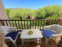 "Dalia 19 - Vista Village", maison mitoyenne 2 pièces 55 m2 au 1er étage. Aménagement confortable et plaisant: séjour/salle à manger avec 1 divan-lit double, TV (satellite) et écran plat. Sortie sur la terrasse. 1 chambre double avec véranda. Coin cuisine (4 plaques de cuisson). 2 douches/bidet/WC. Air-conditionné (en sus). Terrasse couverte, jardin. Meubles de terrasse. Vue sur la mer. A disposition: chaise haute pour enfant, lit bébé (en sus). Place de parking No D19 (couvert, cloturée), largeur 230 cm. IUN:E2088- Caractéristiques de l'hébergement