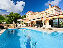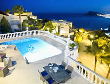 "Del Sol", villa 4 pièces 220 m2 sur 2 niveaux. Spacieux et clair, aménagement très agréable et de bon goût: grand séjour/salle à manger 80 m2 avec TV (satellite) et Télévision numérique. Sortie sur la terrasse, sur la piscine. 1 chambre double avec 1 lit double (2 x 90 cm, longueur 200 cm), douche/bidet/WC, double vasque, air-conditionné et volet roulant électrique. Sortie sur la terrasse, sur la piscine. Cuisine ouverte (four, lave-vaisselle, four micro-ondes, congélateur). WC séparé. À l'étage supérieur: 1 chambre double avec 1 lit double (2 x 90 cm, longueur 200 cm), douche/WC, air-conditionné, ventilateur, chauffage à air chaud et volet roulant électrique. Sortie sur la terrasse. 1 chambre double avec 1 lit double (2 x 90 cm, longueur 200 cm), douche/WC, TV, air-conditionné, ventilateur, chauffage à air chaud et volet roulant électrique. Sortie sur la terrasse. Grande terrasse 120 m2. Meubles de terrasse, barbecue (portable), chaises longues (6), réduit. Superbe vue panoramique sur la mer, les montagnes et les alentours. A disposition: lave-linge, sèche-linge, lit bébé jusqu'à 2 ans. Internet (Connexion WIFI, gratuit). Place de parking (2 Voitures). 1 animal/ chien autorisé. VT-485095-A- Installations