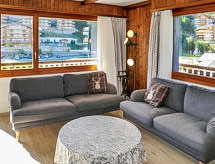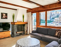 "Ecluses 11", apt 4 pièces 101 m2 au 3ème étage. Spacieux et clair, partiellement rénové en 2015, aménagement confortable et de bon goût: grand séjour/salle à manger avec cheminée et TV (câblée). Sortie sur le balcon. 1 chambre avec 2 lits (90 cm, longueur 190 cm). Sortie sur le balcon, orientée nord. 1 petite chambre avec 1 lit (90 cm, longueur 190 cm). Sortie sur le balcon, orientée ouest. 1 grande chambre avec 3 lits (90 cm, longueur 190 cm). Sortie sur le balcon, orientée nord. Cuisine (four, lave-vaisselle, 4 plaques vitrocéramiques, cafetière électrique, Capsules pour machine à café (nespresso) (NON INCLUSES), appareil à raclette, service à fondue (fondue au fromage)). Sortie sur le balcon. Bain/bidet/WC, WC séparé. Grand balcon 28 m2, situation sud et situation ouest balcon, situation nord. Mobilier de balcon. Vue sur les montagnes et la localité. A disposition: Internet (Connexion WIFI, gratuit). Garage No 11, hauteur 270 cm, largeur 230 cm.- Installations