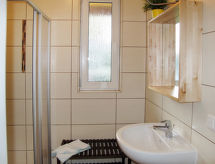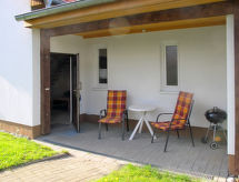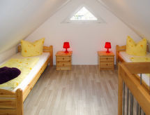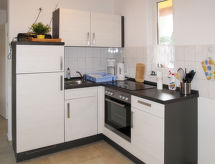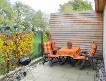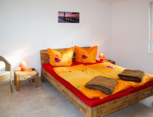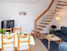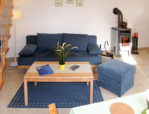 "Ella", maison 2 pièces 69 m2 sur 2 niveaux. Aménagement agréable et de bon goût: séjour/salle à manger avec cheminée, TV (satellite) et radio. Sortie sur la terrasse. 1 chambre double. Coin cuisine (four, 4 plaques vitrocéramiques, grille-pain, bouilloire électrique, cafetière électrique). Douche/WC. À l'étage supérieur: galerie mansardée, ouverte avec 2 lits. Chauffage électrique. Grande terrasse 20 m2, petite terrasse 4 m2, couverte, pelouse 100 m2. Meubles de terrasse, barbecue (portable). A disposition: chaise haute pour enfant, lit bébé. Veuillez noter: logement non-fumeur. Détecteur de fumée.- Installations