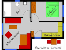 Bungalow 2 pièces 45 m2. Aménagement moderne: séjour/chambre à coucher avec 1 divan-lit, table pour les repas, coin repas, TV (satellite), radio et DVD. Sortie sur la terrasse. 1 chambre avec 1 lit double. Cuisine ouverte (4 feux, grille-pain, bouilloire électrique, four micro-ondes, cafetière électrique). Douche/WC. Chauffage par le sol. Terrasse. Meubles de terrasse. A disposition: chaise haute pour enfant, lit bébé. Internet (Connexion WIFI, gratuit). Veuillez noter: logement non-fumeur. 1 animal/ chien autorisé. Détecteur de fumée, extincteur. Le bungalow est totalement accessible pour les fauteuils roulants.- Installations