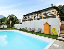 Apt 3 pièces 60 m2 sur 2 niveaux. Complètement rénové en 2018, aménagement confortable et moderne: séjour/salle à manger avec 1 divan-lit double et TV (satellite). Coin cuisine (4 plaques de cuisson, four, lave-vaisselle, bouilloire électrique, four micro-ondes, cafetière électrique). À l'étage supérieur: 1 chambre double. 1 chambre avec 2 lits. Douche/bidet/WC. Chauffage au gaz (en sus). Grand balcon ou jardin. Mobilier de balcon, barbecue. Vue panoramique sur le lac et les montagnes. A disposition: lave-linge. Internet (Connexion WIFI, gratuit). Veuillez noter: maximum 3 animaux/ chiens autorisés. Entrée privée. CIPAT:068022- Installations