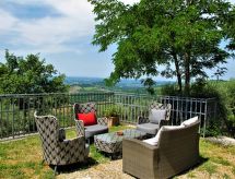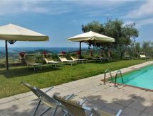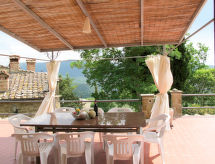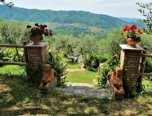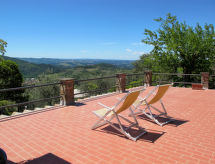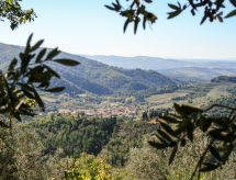 "Fienile", maison jumelée 5 pièces 110 m2 sur 2 niveaux. Spacieux, aménagement rustique et à l'ancienne: grand séjour/salle à manger avec cheminée, table pour les repas et TV (satellite). Sortie sur la terrasse. 2 chambres doubles. Petite cuisine (2 plaques de cuisson, four, lave-vaisselle, 4 feux, grille-pain, bouilloire électrique, four micro-ondes, cafetière électrique). Sortie sur le balcon. Douche/bidet/WC. À l'étage supérieur: 1 chambre double. 1 chambre avec 2 lits (80 cm). Douche/bidet/WC. Chauffage au gaz (en sus). Sol en pierres naturelles. Balcon, grande terrasse 40 m2 partiellement couverte. Meubles de terrasse, mobilier de balcon, barbecue. Superbe vue panoramique sur Chianti. A disposition: chaise haute pour enfant, lit bébé jusqu'à 2 ans, sèche-cheveux. Internet (Connexion WIFI, gratuit). Place de parking (2 Voitures) près de la maison. Veuillez noter: adapté(e) aux familles. Logement non-fumeur. Maximum 2 animaux/ chiens autorisés. Entrée privée.- Installations