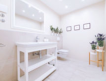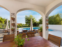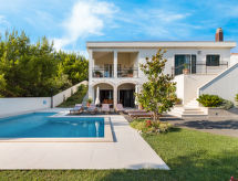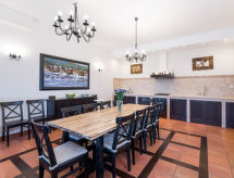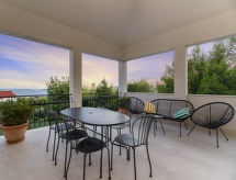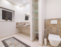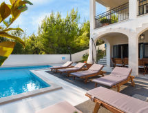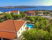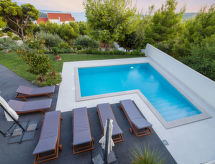 Maison individuelle "Frasena", de 2 étages. Dans le quartier de Seget Donji, à 5.5 km du centre de Trogir, à 25 km du centre de Split, situation ensoleillée, surélevée, à 2.5 km de la mer, à 2.5 km de la plage. A usage privé: terrain 2'011 m2 (clôturé), piscine (40 m2, profondeur 150 cm, disponibilité saisonnière: 01.Mai. - 31.Oct.) avec marches intérieures et systeme d'électolyseur au sel. Piscine de forme irrégulière. Douche extérieure, terrasse (13 m2), meubles de jardin. Infrastructures de la Maison: accès internet, ping-pong, lave-linge, sèche-linge. Place de parking près de la maison sur le terrain. Magasins 2 km, restaurant 2 km, plage de graviers 2.5 km. Terrain de golf 30 km, tennis 3 km. Groupes de jeunes sur demande seulement. Veuillez noter: route principale à proximité 50 m de la maison. Aéroport 9 km de la maison.Interior