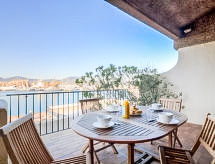 Apt 2 pièces 45 m2 au 1er étage, situation nord-est. Aménagement confortable: séjour/salle à manger avec 1 divan-lit double (140 cm, longueur 190 cm), TV (écran plat), ventilateur. Sortie sur la terrasse. 1 chambre avec 1 grand-lit (160 cm, longueur 190 cm). Cuisine ouverte (4 plaques de cuisson, four, lave-vaisselle, four micro-ondes, congélateur, cafetière électrique). Salle de bains, WC séparé. Terrasse 16 m2. Meubles de terrasse, chaises longues (2). Belle vue sur le port. A disposition: lave-linge. Internet (Connexion WIFI, en sus). Veuillez noter: pas de parking. Détecteur de fumée.- Caractéristiques de l'hébergement