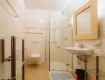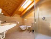 Apt 11 pièces 210 m2 sur 2 niveaux. Clair, aménagement plaisant et avec beaucoup de bois: à l'étage supérieur: 1 chambre avec 1 x 2 lits superposés (80 cm), 1 lit double et douche/WC. Sortie sur le balcon. 1 chambre double avec douche/WC. Sortie sur le balcon. 1 chambre avec 1 lit (80 cm), 1 lit double et douche/WC. Sortie sur le balcon. 2 chambres, chaque chambre avec: 2 lits (80 cm), douche/WC. 1 chambre avec 1 lit (80 cm), douche/WC. Salle à manger avec table pour les repas, TV et poele de faience. Sortie sur le balcon. Petite cuisine ouverte (four, lave-vaisselle, 4 plaques vitrocéramiques, four micro-ondes, congélateur, cafetière électrique). Sortie sur le balcon. 2ème étage: 1 chambre double, mansardée avec douche/WC. Sortie sur le balcon. 1 chambre, mansardée avec 1 x 2 lits superposés (80 cm), 1 lit double et douche/WC. Sortie sur le balcon. 1 chambre, mansardée avec 2 lits (80 cm), douche/WC. 1 chambre, mansardée avec 1 lit (140 cm), douche/WC. Douche/WC. Chauffage au gaz. 4 balcons. Mobilier de balcon. Belle vue sur les montagnes. A disposition: lave-linge, sèche-linge, coffre-fort, lit bébé. Internet (Connexion WIFI). Veuillez noter: logement non-fumeur. Maximum 1 animal/ chien autorisé.- Caractéristiques de l'hébergement