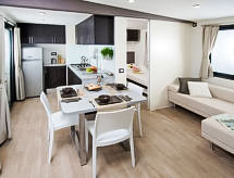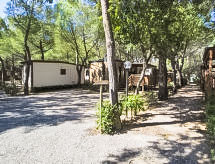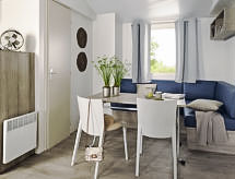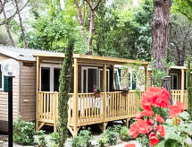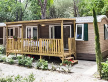 3 pièces mobil home 30 m2. Aménagement fonctionnel et moderne: petit séjour/salle à manger avec coin-cuisine et TV. 1 petite chambre double. 1 petite chambre avec 2 lits. Douche/bidet/WC. Air-conditionné (en sus). Terrasse 15 m2. Meubles de terrasse. A disposition: moustiquaire, sèche-cheveux. Place de parking No 1. 1 animal/ chien autorisé.- Installations