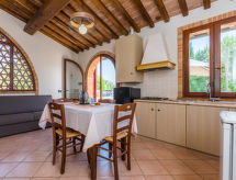Complexe de vacances "Girasole". 5 appartements dans la résidence. À 8 km du centre de Montecatini Val di Cecina, à 2 km du centre de Ponteginori, à 6 km du centre de Saline di Volterra, sur une colline, à 27 km de la mer. En commun: terrain 2 ha (clôturé), jardin sur plusieurs niveaux entretenu, pelouse et arbres, piscine (12 x 6 m, profondeur 150 - 150 cm, disponibilité saisonnière: 15.Mai. - 30.Sep.). Douche extérieure, barbecue, entretien de la piscine par le propriétaire/jardinier. Change de linge (suppl. en sus). Changementde linge de toilette (suppl. en sus). Place de parking sur le terrain. Supermarché 2 km, restaurant 800 m, boulangerie 2 km, gare ferroviaire "Ponteginori" 2.5 km, plage de sable "Marina di Cecina" 27 km, piscine couverte 24 km. Attractions à proximité: San Gimignano 45 km, Pisa 75 km, Firenze 100 km.Interior