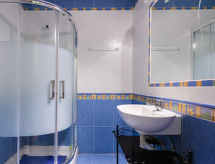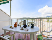 "Grimaca", apt 4 pièces 70 m2 au 5ème étage. Logement idéal pour 6 adultes. Aménagement fonctionnel: séjour/salle à manger avec table pour les repas, Télévision numérique, écran plat et ventilateur. Sortie sur le balcon. 1 chambre avec 1 grand-lit (135 cm, longueur 190 cm), douche/bidet/WC et ventilateur. 2 chambres, sans fenêtre, chaque chambre avec: 2 lits (90 cm, longueur 190 cm), ventilateur. Petite cuisine (2 plaques vitrocéramiques, grille-pain, four micro-ondes, congélateur, gril). Douche/bidet/WC. Chauffe eau (80 litres). Grand balcon. Mobilier de balcon. Belle vue sur la mer et la localité. A disposition: lave-linge, fer à repasser. Veuillez noter: logement non-fumeur. 1 animal/ chien autorisé. VT-34039-CS- Installations