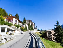 Studio 50 m2 au 5ème étage. Aménagement confortable et rustique: séjour/salle à manger avec 2 lits armoires et TV (câblée) (écran plat), radio. Sortie sur le balcon. Alcôve avec rideau avec 2 lits. Cuisine (four, lave-vaisselle, 4 plaques vitrocéramiques). Bain/WC. Balcon 7 m2, situation sud. Belle vue sur les montagnes, les alentours et la localité. A disposition: Internet (Connexion WIFI, gratuit). Place de parking. Veuillez noter: logement non-fumeur.- Installations