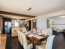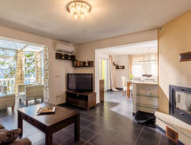 Maison 6 pièces 180 m2 sur 2 niveaux. Séjour/salle à manger avec 1 divan-lit, coin-cuisine et TV (satellite) (écran plat), air-conditionné. Sortie sur la terrasse. 1 chambre avec 1 grand-lit. Séjour/salle à manger avec cheminée et TV (satellite) (écran plat), air-conditionné. Sortie sur la terrasse. Cuisine ouverte (four, lave-vaisselle, 1 plaque vitrocéramiques, 3 feux, grille-pain, bouilloire électrique, four micro-ondes, congélateur, cafetière électrique). Douche/WC, WC séparé. À l'étage supérieur: entrée avec air-conditionné. 1 chambre avec 1 grand-lit (160 cm). Sortie sur le balcon. 1 chambre avec 1 grand-lit. 1 chambre avec 1 lit double. Bain/douche, WC séparé. Balcon, 2 terrasses. Meubles de terrasse. Vue sur la mer. A disposition: lave-linge, fer à repasser. Internet (Connexion WIFI, gratuit). Veuillez noter: maison non-fumeur. Pas de liaison interne entre les différentes unités. Occupation maximale: 8 adultes, 1 enfant de moins de 12 ans.- Caractéristiques de l'hébergement