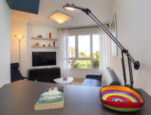 "Horizonte", apt 2 pièces 56 m2, à l'entresol. Aménagement confortable: séjour/salle à manger 20 m2, sur 2 niveaux avec Télévision numérique, air-conditionné et chauffage à air chaud. 1 chambre avec 1 grand-lit (150 cm, longueur 190 cm), Télévision numérique, air-conditionné et chauffage à air chaud. Cuisine ouverte (four, lave-vaisselle, 4 plaques vitrocéramiques, bouilloire électrique, four micro-ondes, congélateur, cafetière électrique). Douche/WC. Vue latérale sur la mer. A disposition: lave-linge, coffre-fort, fer à repasser, sèche-cheveux. Internet (Connexion WIFI, gratuit). Place de parking No 9. R000000010- Installations