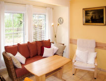Maison jumelée "Im Kiefernweg", année de construction 2003. À 800 m du centre de Zinnowitz, à 10 km du centre de Wolgast, à 38 km du centre de Greifswald, à 800 m de la mer, dans une impasse. A usage privé: terrain 200 m2, jardin entretenu (pas clôturé) avec plantes. 35 m sentier jusqu'à la maison. Place de parking près de la maison. Supermarché 500 m, plage de sable 800 m, piscine couverte 1 km.Interior