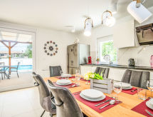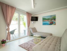 Gornja Hlapa à 2 km de Dobrinj: Maison individuelle "Ivana", de 3 étages, année de construction 2018. À 3 km du centre de Solin, à 5 km du centre de Klimno, à 12.5 km du centre de Malinska, situation tranquille, ensoleillée, à 2.5 km de la mer, à 2.5 km de la plage, dans une impasse. A usage privé: terrain 580 m2 (clôturé) avec plantes, piscine rectangulaire (8 x 4 m, profondeur 140 cm, disponibilité saisonnière: 01.Mai. - 15.Oct.) avec marches intérieures. Douche extérieure. Infrastructures de la Maison: accès internet, sauna, système d'alarme, lave-linge. Place de parking (pour 3 voitures) près de la maison sur le terrain. Magasins 950 m, supermarché 11 km, restaurant 950 m, plage de graviers 2.5 km, plage bétonnée 2.5 km. Groupes de jeunes sur demande seulement. La propriété est sous vidéo surveillance. Le double du montant de la caution est exigé à l'arrivée pour des groupes de jeunes.Interior
