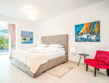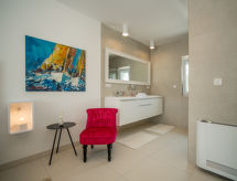 Maison 4 pièces 150 m2 sur 3 niveaux. Séjour/salle à manger avec TV (satellite) (écran plat), air-conditionné. Sortie sur la terrasse. 1 chambre avec 1 grand-lit (180 cm, longueur 200 cm), TV (satellite) (écran plat), air-conditionné. Cuisine ouverte (four, lave-vaisselle, 4 plaques vitrocéramiques, four micro-ondes, congélateur, cafetière électrique). Douche/WC. À l'étage inférieur: 1 chambre 25 m2 avec 1 grand-lit (180 cm, longueur 200 cm), douche/WC et TV (satellite) (écran plat), air-conditionné. Sortie sur la terrasse. À l'étage supérieur: 1 grande chambre 40 m2 avec 1 grand-lit (180 cm, longueur 200 cm), douche/bidet/WC, double vasque et TV (satellite) (écran plat), air-conditionné. Sortie sur la terrasse. Chauffage par le sol (en sus). Terrasse 45 m2, terrasse 100 m2 partiellement couverte. Meubles de terrasse, barbecue (portable), chaises longues. Vue sur la piscine. A disposition: Internet (Connexion WIFI, gratuit). Terrasse 35 m2.- Installations