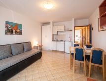 Apt 2 pièces 45 m2 au 1er étage. Séjour/salle à manger avec 1 divan-lit double (160 cm, longueur 200 cm), coin-cuisine et TV (satellite) (écran plat), air-conditionné. Sortie sur le balcon. 1 chambre avec 1 lit double (2 x 80 cm, longueur 200 cm). Douche/WC. Balcon 5 m2. Mobilier de balcon. Vue partielle sur la mer. A disposition: Internet (Connexion WIFI, gratuit).