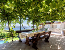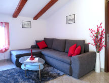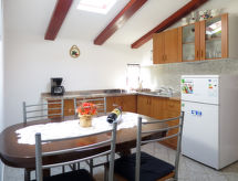 Apt 3 pièces 60 m2 au 1er étage. Séjour mansardé avec TV (satellite). Entrée avec air-conditionné. 1 chambre mansardée avec 1 grand-lit (140 cm, longueur 200 cm). 1 chambre mansardée avec 1 divan-lit et 1 grand-lit (140 cm, longueur 200 cm). Cuisine (2 feux, grille-pain, bouilloire électrique, four micro-ondes, congélateur, cafetière électrique) avec table pour les repas. 2 douches/WC. Vue sur la mer. A disposition: lave-linge. Internet (Connexion WIFI, gratuit). Veuillez noter: maison non-fumeur.- Installations