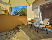 Studio 36 m2, au rez-de-chaussée, situation sud-est. Studio avec 1 divan-lit (125 cm, longueur 200 cm), 1 lit double (2 x 90 cm, longueur 200 cm), TV (satellite) (écran plat), air-conditionné. Sortie sur la terrasse. Cuisine ouverte (2 plaques vitrocéramiques, grille-pain, bouilloire électrique, congélateur, cafetière électrique). Douche/WC. Terrasse 28 m2. Meubles de terrasse. A disposition: lave-linge. Internet (Connexion WIFI, gratuit). 1 animal/ chien autorisé.- Installations