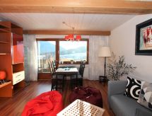 Apt 2 pièces 72 m2 au 1er étage. Rénové en 2015, aménagement agréable et plaisant: entrée. Séjour/chambre à coucher avec 1 divan-lit, 2 lits rabattables, table pour les repas et TV (câblée) (écran plat). Sortie sur le balcon. 1 chambre double. Sortie sur le balcon. Cuisine (four, lave-vaisselle, 4 plaques vitrocéramiques, four micro-ondes). Bain/WC. Grand balcon, situation sud et situation est. Superbe vue sur les montagnes, les pistes de ski et les alentours. A disposition: Internet (Connexion WIFI, gratuit). Veuillez noter: logement non-fumeur.- Installations