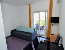"Katarina 4 (SIB158)", apt 2 pièces 40 m2, au rez-de-chaussée. Séjour/salle à manger avec 1 divan-lit double et TV (satellite) (écran plat), air-conditionné. Sortie sur la terrasse. 1 chambre avec 1 lit double. Cuisine ouverte (2 plaques vitrocéramiques, grille-pain, bouilloire électrique, cafetière électrique). Douche/WC. Terrasse partiellement couverte. Meubles de terrasse, chaises longues (1). A disposition: Internet (Connexion WIFI, gratuit). Place de parking (1 Voiture). Veuillez noter: entrée privée.- Installations