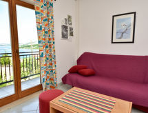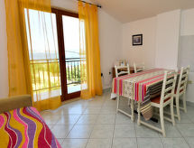 Maison 6 pièces 150 m2 sur 2 niveaux. Séjour/salle à manger 33 m2 avec cheminée, TV (satellite) et air-conditionné. Sortie sur la terrasse. 2 chambres, chaque chambre avec: 1 grand-lit (160 cm, longueur 200 cm). Cuisine ouverte (4 plaques de cuisson, four, lave-vaisselle, congélateur). Douche/WC. À l'étage supérieur: (escalier extérieur) séjour avec 1 divan-lit, TV (satellite) et air-conditionné. Sortie sur le balcon. 1 chambre avec 1 lit (90 cm, longueur 200 cm), 1 grand-lit (160 cm, longueur 200 cm). 1 chambre avec 1 grand-lit (160 cm, longueur 200 cm). Cuisine ouverte (2 plaques de cuisson) avec table pour les repas, air-conditionné. Sortie sur le balcon. 2 douches/WC. Air-conditionné (en sus). Balcon 8 m2, grande terrasse 35 m2, terrasse 16 m2. Meubles de terrasse. Très belle vue panoramique sur la mer et les alentours. A disposition: lave-linge. Internet (Connexion WIFI, gratuit). 2 animaux/ chiens autorisés.- Installations