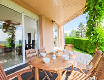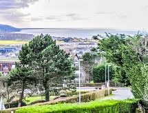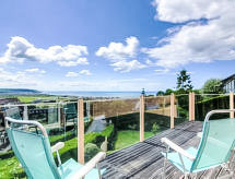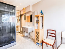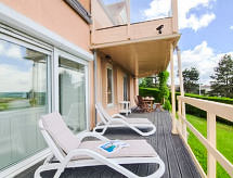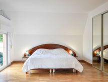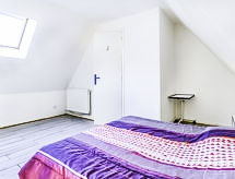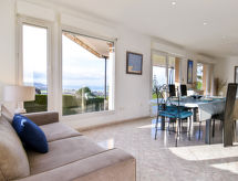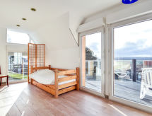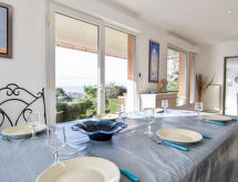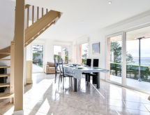 Maison 5 pièces 150 m2 sur 2 niveaux. Aménagement très simple: grand séjour/salle à manger 63 m2 avec baie vitrée avec TV (écran plat), volet roulant électrique. Sortie sur la terrasse. Cuisine (4 plaques de cuisson, four, lave-vaisselle, grille-pain, bouilloire électrique, four micro-ondes, congélateur, cafetière électrique). Sortie sur la terrasse. Douche, WC séparé. À l'étage supérieur: (escalier raide) 1 chambre, mansardée, ouverte avec 1 divan-lit (140 cm, longueur 190 cm), douche/WC. 1 chambre avec 1 grand-lit (140 cm). 1 grande chambre avec 1 grand-lit (140 cm). Sortie sur la terrasse. Douche/WC. Terrasse 17 m2, situation ouest terrasse 30 m2, situation ouest. Meubles de terrasse. Très belle vue panoramique sur la mer et les alentours. A disposition: lave-linge. Internet (Connexion WIFI, gratuit). Veuillez noter: maison non-fumeur. Maximum 1 animal/ chien autorisé. Détecteur de fumée. Attention, le poêle visible sur les photos n'est pas en état de marche.- Installations