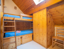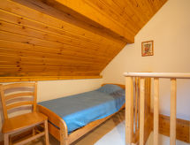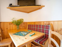 Appartement sur 2 niveaux 3 pièces 60 m2 au 1er étage. Mansardé, aménagement confortable et agréable: séjour/salle à manger avec 1 divan-lit double (1 x 130 cm, longueur 190 cm), TV, écran plat et DVD. Sortie sur le balcon. Coin cuisine (4 plaques de cuisson, four, lave-vaisselle, grille-pain, bouilloire électrique, four micro-ondes, cafetière électrique, appareil à raclette, service à fondue (fondue au fromage)). Salle de bains, WC séparé. Chauffage électrique. À l'étage supérieur: 1 chambre, mansardée avec 1 grand-lit (160 cm). Alcôve ouverte avec fenêtre sous le toit avec 1 x 2 lits superposés (90 cm). (échelle) galerie, hauteur plafond 90 - 150 cm avec 2 lits (90 cm). Douche/WC. Chauffage électrique. Sol en parquet. Situation sud. Meubles de terrasse, mobilier de balcon, chaises longues. Belle vue sur les montagnes et la localité. A disposition: lave-linge, fer à repasser, lit bébé jusqu'à 2 ans. Place de parking. Veuillez noter: détecteur de fumée. Pour accéder aux couchages de la Galerie échelle amovible non recommandée aux enfants de -10 ans.- Activités à proximité
