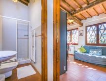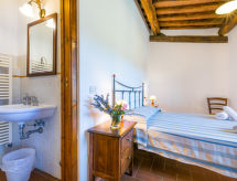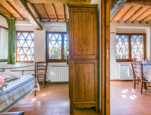 Grand[e] sur un domaine viticole maison de campagne rustique "Fattoria l'Ottavo", 400 m au dessus du niveau de la mer, du 18ème siècle, renové, environné par les prés et vignobles. 3 maisons dans la résidence. 9 appartements dans la résidence. Dans le quartier de Lucolena in Chianti, à 12 km du centre de Greve in Chianti, à 13 m du centre de Figline Valdarno, situation isolée, ensoleillée, surélevée, dans la verdure. En commun: terrain 40 ha, jardin naturel, champ, piscine cloturée (8 x 4 m, disponibilité saisonnière: 01.Mai. - 15.Oct. horaires d'ouverture de la piscine: 08:00-20:00). Douche extérieure, terrasse, meubles de jardin, barbecue, entretien de la piscine par le propriétaire/jardinier. Infrastructures de la Maison: réception, restaurant, salle pour petits déjeuners, Connexion WIFI, lave-linge (en commun). Change de linge 1 fois par semaine. Petit-déjeuner possible sur demande (en sus). Accès en voiture jusqu'à le terrain par un chemin étroite de 200 m de long. Place de parking sur le terrain. Magasins, magasin d'alimentation 700 m, supermarché 12 km, centre commercial 13 km, restaurant 1 km, bar, boulangerie 700 m, location de bicyclettes 12 km, arrêt de bus "Lucolena" 700 m, gare ferroviaire "Figline Valdarno" 13 km, plage de sable "Calambrone" 110 km, piscine couverte 13 km, lac Trasimeno 114 km. Terrain de golf (18 trous) 20 km, tennis 12 km, centre équestre 2 km, chemins de randonnées pédestres depuis la maison 100 m. Attractions à proximité: Firenze 37 km, Siena 50 km, Arezzo 54 km, San Gimignano 65 km. Veuillez noter: voiture recommandée. Réception ouverte de 10:00-17:00 heures. Adapté(e) aux familles, équipement pour bébés (inclus). Adapté à l'organisation d'évènements. Vente locale de produits de la ferme. Veuillez noter: le propriétaire habite sur le même terrain. Toutes les maisons/appartements sont aménagés individuellement.Interior