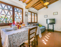 "La Vigna", maison 3 pièces 70 m2, au rez-de-chaussée. Spacieux, aménagement fonctionnel et rustique: séjour/salle à manger avec table pour les repas, coin repas et TV (écran plat). 2 chambres doubles, chaque chambre avec: douche/WC. Cuisine ouverte (four, lave-vaisselle, Poêle à gaz, 4 feux, cafetière électrique). Chauffage au gaz. Terrasse, grand jardinet. Meubles de terrasse, barbecue, chaises longues. Belle vue sur les alentours. A disposition: coffre-fort, moustiquaire, chaise haute pour enfant, lit bébé jusqu'à 2 ans, sèche-cheveux. Internet (Connexion WIFI, gratuit). Place de parking (2 Voitures) près de la maison. Veuillez noter: logement non-fumeur. 2 animaux/ chiens autorisés. Entrée privée.- Installations