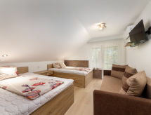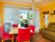 Balatonmáriafürdő: Maison jumelée accueillante "Lampion", de 2 étages. Dans la localité, à 900 m du centre, situation ensoleillée, à 300 m du lac. A usage privé: terrain 200 m2 (clôturé), jardin, pré. Infrastructures de la Maison: air-conditionné (en sus). Magasin d'alimentation 900 m, restaurant 750 m, plage de gazon 300 m.Interior