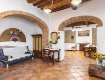 Chianti Classico à 14 km de Castellina in Chianti: Propriété nichée dans un splendide paysage toscan, entre les vignes et les oliveraies, dans une petite exploitation agricole. Maison de maitre et annexe, datant de 1600, divisée en 4 unités locatives. Chaque appartement avec entrée indépendante et espace extérieur privé. TV satellite sur demande, 20 euros la semaine. Domaine agricole rustique "Le Buche". À 14 km du centre de Castellina in Chianti, à 38 km du centre de Siena, à 49 km du centre de Firenze, situation tranquille, ensoleillée, dans la verdure. En commun: piscine cloturée (6 x 12 m, profondeur 130 - 230 cm, disponibilité saisonnière: 15.Mai. - 15.Oct.). Ping-pong, barbecue. Chauffage payable localement (01.11. - 15.04.), possibilité de chauffage uniquement du 01.11. au 15.04.. Accès en voiture jusqu'à la maison (600 m chemin non goudronné). Place de parking sur le terrain. Magasins 6 km, magasin d'alimentation 6 km, restaurant 6 km, gare ferroviaire "Poggibonsi" 6 km, centre thermal "Rapolano Terme" 64 km. Terrain de golf 10 km, tennis 6 km, centre équestre 10 km. Attractions à proximité: Barberino Val D'elsa 16 km, San Gimignano 21 km, Monteriggioni e San Donato 22 km, Radda in Chianti 24 km, Badia a Passignano 25 km, Volterra 40 km. Vente locale de produits de la ferme.Interior