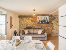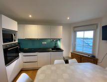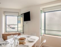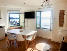 "Le point du jour 1", apt 3 pièces 50 m2 au 1er étage. Spacieux et clair, complètement rénové en 2021, aménagement moderne et de bon goût: séjour avec TV (écran plat). 1 chambre avec 1 grand-lit (1 x 180 cm, longueur 200 cm). 1 petite chambre, sans fenêtre avec 2 x 2 lits superposés (90 cm, longueur 190 cm). Cuisine ouverte (four, lave-vaisselle, 3 plaques à induction, grille-pain, bouilloire électrique, four micro-ondes, congélateur, cafetière électrique) avec table pour les repas. Douche, WC séparé. Chauffage électrique. Sol en parquet. Superbe vue sur la mer. Veuillez noter: maison non-fumeur. Détecteur de fumée.- Installations