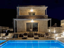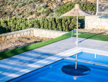 "Lefkopetra", villa 4 pièces 120 m2. Spacieux et clair, aménagement très confortable et luxueux: séjour/salle à manger ouvert avec 2 divans-lits, cheminée, table pour les repas, TV (satellite) et air-conditionné. Sortie sur la véranda, sur la piscine. 1 chambre double avec 2 lits, TV (satellite) et air-conditionné. Sortie sur la piscine. Grande cuisine (4 plaques de cuisson, lave-vaisselle, grille-pain, four micro-ondes, congélateur, cafetière électrique). Sortie sur la piscine. Salle de bains. À l'étage supérieur: 2 chambres doubles, chaque chambre avec: 1 lit double, salle de bains, TV (satellite) et air-conditionné. Sortie sur la véranda. Barbecue, place pour s'asseoir. Très belle vue panoramique sur la mer, la piscine et le jardin. A disposition: lave-linge, coffre-fort, fer à repasser, sèche-cheveux. Internet (Connexion WIFI, gratuit). Adapté(e) aux familles. 1041K122K2675901- Installations
