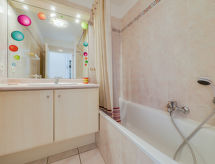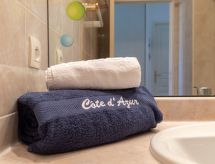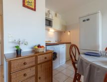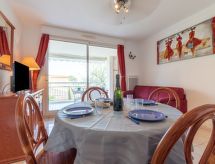 Apt 2 pièces 35 m2 au 2ème étage. Logement idéal pour 2 adultes + 2 enfants. Aménagement agréable: séjour/salle à manger avec baie vitrée avec 1 divan-lit double (1 x 140 cm, longueur 200 cm), TV (écran plat), ventilateur et volet roulant électrique. Sortie sur la terrasse. 1 chambre avec 2 lits (80 cm, longueur 200 cm), ventilateur et volet roulant électrique. Sortie sur la terrasse. Cuisine ouverte (lave-vaisselle, 3 plaques vitrocéramiques, grille-pain, bouilloire électrique, congélateur, cafetière électrique, combiné micro-ondes). Salle de bains, WC séparé. Terrasse 15 m2, couverte. Meubles de terrasse. Vue partielle sur la mer. A disposition: lave-linge, fer à repasser, sèche-cheveux. Internet (Connexion WIFI, en sus). Place de parking No A24 (couvert, 1 Voiture). Veuillez noter: adapté(e) aux familles. TV seulement FR. Détecteur de fumée.- Caractéristiques de l'hébergement
