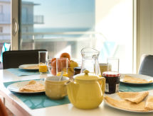 Apt 2 pièces 52 m2 au 2ème étage. Complètement rénové en 2017: séjour/salle à manger avec 1 divan-lit double (1 x 140 cm), TV (écran plat). 1 chambre avec 2 lits (80 cm, longueur 200 cm). Cuisine (four, lave-vaisselle, 2 plaques vitrocéramiques, four micro-ondes, congélateur, cafetière électrique). Douche, WC séparé. Chauffage électrique. Balcon 8 m2. Vue sur la mer. A disposition: lave-linge, fer à repasser. Internet (Connexion WIFI, gratuit). Place de parking No 36. Veuillez noter: détecteur de fumée.- Caractéristiques de l'hébergement