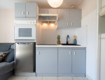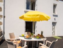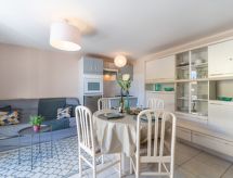 Apt 3 pièces 45 m2, au rez-de-chaussée. Séjour/salle à manger avec TV (écran plat). 1 chambre avec 1 grand-lit (1 x 140 cm, longueur 190 cm). 1 chambre avec 1 lit gigogne (2 pers. 2 x 80 cm, longueur 190 cm). Cuisine ouverte (four, 4 plaques vitrocéramiques, grille-pain, bouilloire électrique, cafetière électrique). Douche/WC. Meubles de terrasse. A disposition: Internet (Connexion WIFI, en sus). 1 animal/ chien autorisé.- Installations