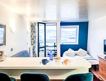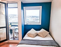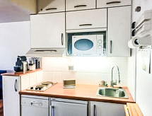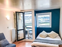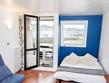 Studio 23 m2 au 6ème étage, situation est. Séjour/salle à manger avec 1 divan-lit (140 cm, longueur 190 cm), TV (écran plat). Sortie sur le balcon. Coin cuisine (2 plaques de cuisson, lave-vaisselle, grille-pain, bouilloire électrique, four micro-ondes, cafetière électrique). Salle de bains, WC séparé. Petit balcon 1 m2. Mobilier de balcon. Belle vue sur la localité et la baie. A disposition: Internet (Connexion WIFI, en sus). Veuillez noter: logement non-fumeur. Détecteur de fumée.- Caractéristiques de l'hébergement