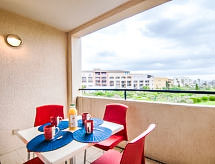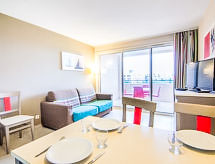 Apt 2 pièces 31 m2 au 2ème étage. Logement idéal pour 2 adultes + 2 enfants. Aménagement plaisant: séjour/salle à manger avec 1 divan-lit double (160 cm, longueur 190 cm), TV (écran plat). Sortie sur la terrasse. 1 chambre avec 2 lits (80 cm, longueur 190 cm). Coin cuisine (lave-vaisselle, 4 plaques vitrocéramiques, four micro-ondes, cafetière électrique). Salle de bains, WC séparé. Terrasse 8 m2. Meubles de terrasse. Vue sur la mer et la piscine. A disposition: Internet (Connexion WIFI, en sus). Place de parking No 248. Veuillez noter: maximum 1 animal/ chien de petite taille autorisé. Détecteur de fumée. 83065000093SL- Caractéristiques de l'hébergement