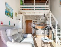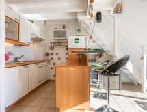 Apt 2 pièces 42 m2 sur 2 niveaux au 2ème étage. Aménagement confortable et agréable: séjour/salle à manger avec TV (écran plat), air-conditionné. Sortie sur la terrasse. 1 chambre avec 1 grand-lit (160 cm, longueur 190 cm). Sortie sur la terrasse. Coin cuisine (lave-vaisselle, 4 plaques vitrocéramiques, congélateur, cafetière électrique, combiné micro-ondes). Douche, WC séparé. À l'étage supérieur: galerie mansardée, hauteur plafond 140 - 200 cm avec 1 grand-lit (140 cm, longueur 200 cm), air-conditionné. Terrasse 16 m2, situation sud-est. Meubles de terrasse. Belle vue sur les montagnes. A disposition: lave-linge. Internet (Connexion WIFI, en sus). Place de parking. Veuillez noter: détecteur de fumée.- Caractéristiques de l'hébergement