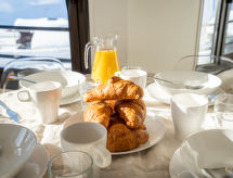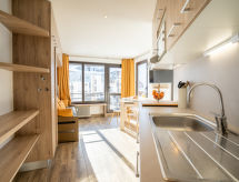 Studio 26 m2 au 1er étage. Logement idéal pour 2 adultes + 2 enfants. Complètement rénové en 2017, aménagement confortable et de bon goût: séjour/salle à manger avec 1 divan-lit double (140 cm, longueur 190 cm), 1 lit gigogne (2 pers. 2 x 80 cm, longueur 190 cm), TV (écran plat). Sortie sur le balcon. Coin cuisine (four, lave-vaisselle, 3 plaques à induction, four micro-ondes, cafetière électrique, Capsules pour machine à café (Nespresso) (NON INCLUSES)). Douche/WC. Chauffage. Balcon 5 m2, situation sud-ouest. Mobilier de balcon. Très belle vue panoramique sur les montagnes et les pistes de ski. A disposition: sèche-cheveux. Internet (Connexion WIFI, gratuit). Veuillez noter: logement non-fumeur. Détecteur de fumée. Géometrie de l'appartement originale qui lui apporte un large espace de vie et un bel ensoleillement.- Installations