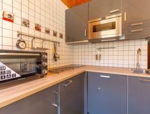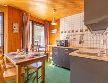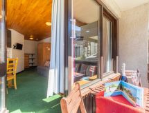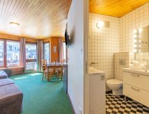 Studio 26 m2 au 2ème étage. Rénové, aménagement fonctionnel et agréable: séjour/salle à manger avec 2 lits gigognes (4 pers. 2 x 80 cm, longueur 190 cm), TV (écran plat). Sortie sur le balcon, orientée sud et orientée ouest. Cuisine ouverte (lave-vaisselle, 2 plaques à induction, four micro-ondes). Douche/WC. Balcon, situation sud. Très belle vue panoramique sur les montagnes et les alentours. A disposition: lave-linge. Internet (Connexion WIFI, gratuit). Veuillez noter: logement non-fumeur. Détecteur de fumée.- Installations