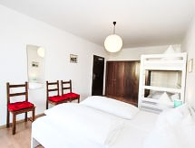 Apt 2 pièces 55 m2, au rez-de-chaussée. Rénové en 2016, aménagement plaisant: entrée. Grand séjour/salle à manger avec 1 divan-lit double, table pour les repas et TV (câblée) (écran plat). Sortie sur le jardin, sur la terrasse. 1 chambre avec 1 x 2 lits superposés, 1 lit double. Sortie sur la terrasse. Coin cuisine (four, lave-vaisselle, 4 plaques vitrocéramiques, four micro-ondes). Bain/WC. Meubles de terrasse. A disposition: lit bébé, sèche-cheveux. Internet (Connexion WIFI, gratuit). Veuillez noter: logement non-fumeur. Maximum 1 animal/ chien autorisé. Terrasse en commun.- Installations