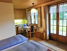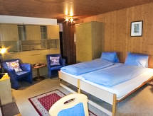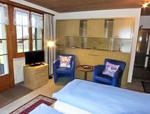 Studio 24 m2. Aménagement plaisant: séjour/chambre à coucher avec 2 lits (90 cm, longueur 200 cm), TV (câblée) et écran plat. Sortie sur le jardinet, orientée sud et orientée ouest. Cuisine ouverte (2 plaques de cuisson, four micro-ondes, cafetière électrique, service à fondue (fondue au fromage)). Douche/WC. Terrasse, situation sud et situation ouest. Meubles de terrasse. Superbe vue sur les montagnes. A disposition: Internet (Connexion WIFI, gratuit). Place de parking près de la maison. Veuillez noter: logement non-fumeur.- Installations