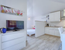 Maison studio 30 m2. Séjour/chambre à coucher avec 1 grand-lit (160 cm, longueur 200 cm), TV (satellite) (écran plat), air-conditionné. Cuisine ouverte (2 plaques de cuisson, cafetière électrique) avec table pour les repas. Douche/WC. Air-conditionné (en sus). Terrasse 15 m2. Meubles de terrasse. Vue sur le jardin. A disposition: Internet (Connexion WIFI, gratuit).- Installations